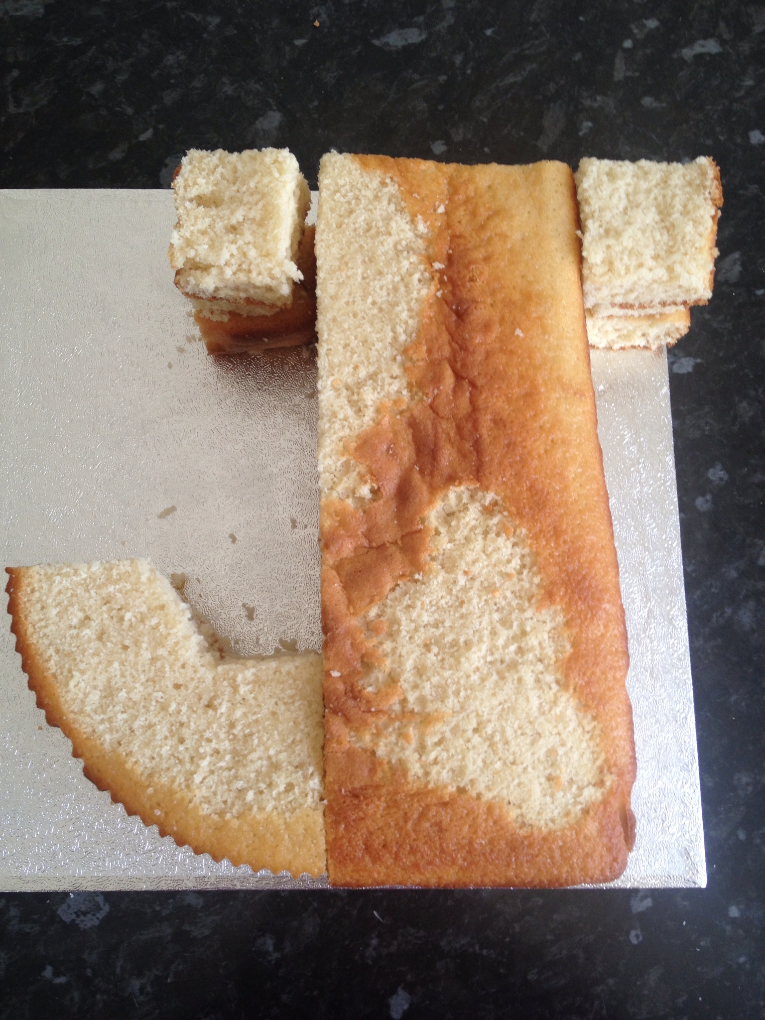 I thought I would give a shaped cake a go – and what better than the letter J. It was a bit of a challenge to work out from the tins that I had what I need to use to make the J shape, but decided to use a rectangular tin and an 7inch round tin. The rectangular tin was the main body of the J with the end being chopped off to be the ‘T’ of the J, and then a quarter of the round cake was the curve of the J – voila a double layer lemon flavoured J to be stuck together with butter cream.